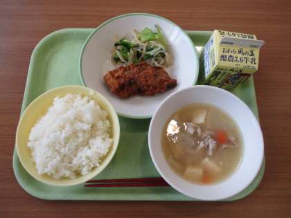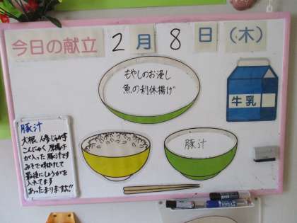 給食メニューです。 ごはん 牛乳 魚の利久揚げ もやしのおひたし 豚汁