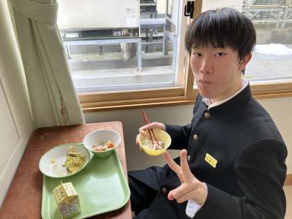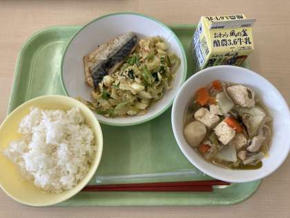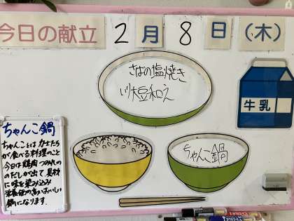 給食メニューです。 ごはん 牛乳 さばの塩焼き いり大豆和え ちゃんこ鍋 放送当番の様子です。