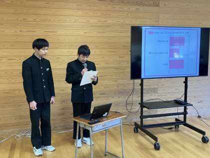 4時間目の授業の様子 1 公開日 2024/02/13 更新日 2024/02/13 日々の活動から 4時間目は、多目的室で厚生実践部主催による学校保健委員会が行われました。 はじめに、生徒によるアンケート結果の発表が行われました。