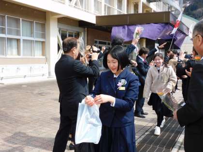 第77回卒業証書授与式 15 公開日 2024/03/14 更新日 2024/03/14 日々の活動から 歓送の様子です。 天候にも恵まれ感動的な式になりました。 8人の生徒が晴れ晴れとした笑顔で旅立つことができました。 清掃・準備してくれた1・2年生のみなさん、関わってくださった方々ありがとうございました。