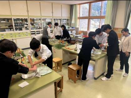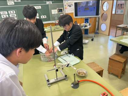 理科の授業では、実験を行いました。 重曹を加熱して発生した気体を集めていました。