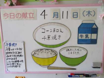 4月11日(木)本日の給食献立&放送当番 公開日 2024/04/11 更新日 2024/04/11 日々の活動から 本日の献立になります。 千草焼きは様々な具材が入った卵焼きで甘みもあり、とてもおいしかったです。