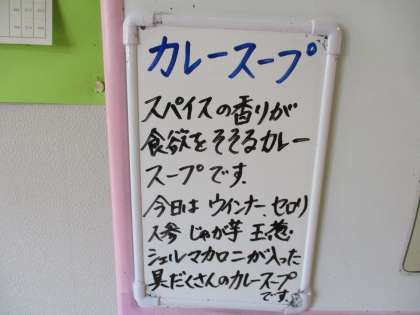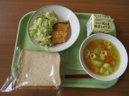 献立になります。 カレースープがスパイシーでおいしかったです!!