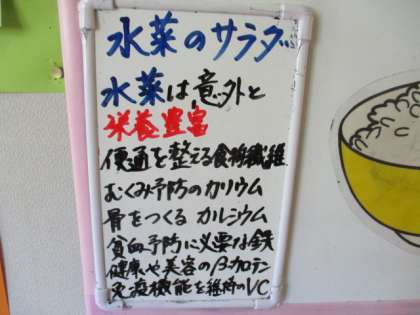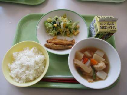 本日の給食です。水菜とコーンの歯ごたえがとてもよかったです。