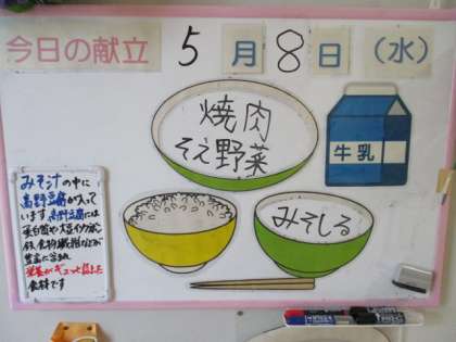 5月8日(水)本日の献立 公開日 2024/05/08 更新日 2024/05/08 日々の活動から 本日のメニューはごはん、牛乳、そえ野菜、焼肉、味噌汁です。 焼肉はたれとお肉が絡み合って、ごはんが最高にすすみます!! そえ野菜はいい塩加減でおいしくいただけます。 今日もおいしい給食ありがとうございます!