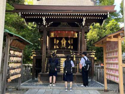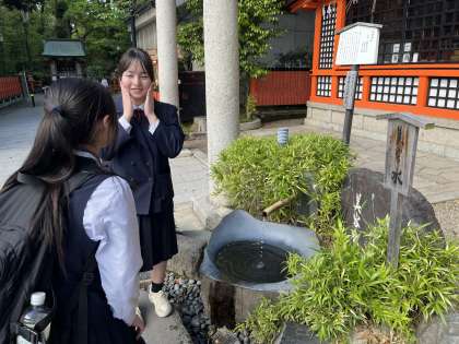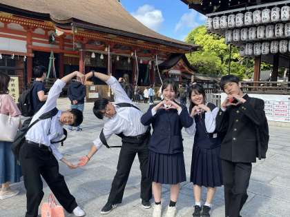 5月8日(水)修学旅行その8 公開日 2024/05/08 更新日 2024/05/08 日々の活動から 八坂神社のグループになります。 八坂神社は、平安京遷都以前からある歴史ある神社になります。 八坂神社内に美容水があり、2、3滴つけると身も心も清らかになり、御利益があるそうです。美容水を塗っていますね。 その後、お詣りをしました。何を願ったのでしょうか。