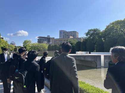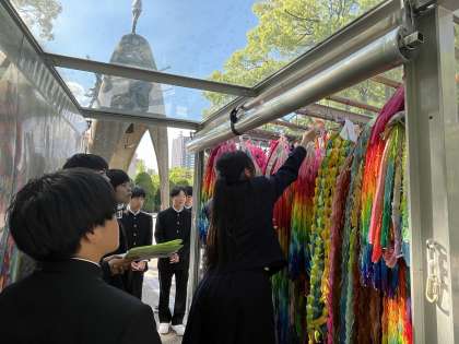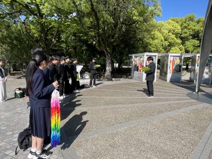 5月9日(木)修学旅行その13 公開日 2024/05/09 更新日 2024/05/09 日々の活動から 広島の平和公園に到着しました。 原子爆弾が投下された8時15分に平和の鐘を聴きました。 平和式典の様子です。厳粛な雰囲気のなか、平和を祈り、全員で折った千羽鶴を奉納しました。 原爆ドームをみています。