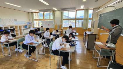 2学年と碧空級は社会に学ぶ『14歳の挑戦』に向けて、自己紹介シートを書いていました。