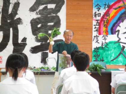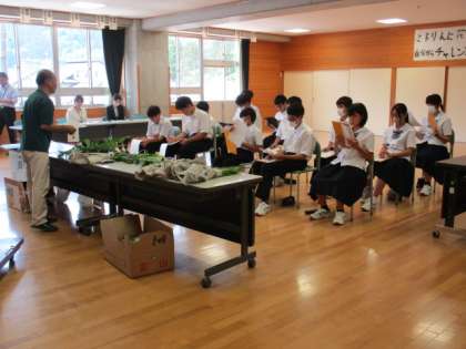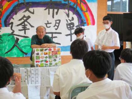また、実際の野菜を見てクイズを出していただきました。らっきょうの葉を知っている楡中生はさすがです!他にも、講師の先生が準備してくださった果物について生徒がヒントを出すクイズにも意欲的に参加していました。