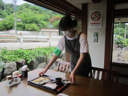 楽今日館では、利用されたお客様の食事の片付けをする生徒や接客に取り組んでいる生徒の活動する様子が見られました。それぞれに一生懸命頑張っています。