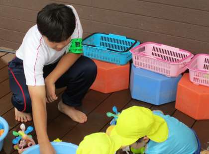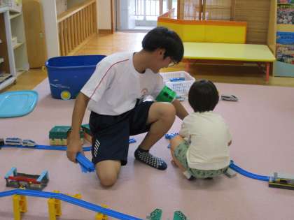 ほそいり保育所で活動している生徒は、園児達と水遊びをしたり一緒に遊んだりしていました。昨日は保育所での七夕まつりに向けて、ちょうちんの飾り付けもしていたそうです。生徒達は、「活動が楽しい」と話してくれました。