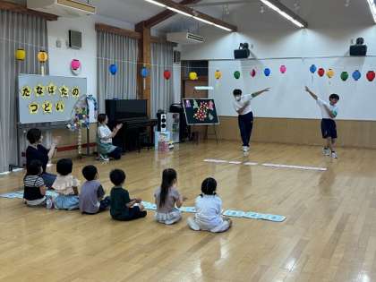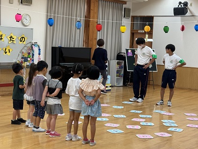 本日、保育所でたなばたのつどいが行われていました。生徒は園児と一緒にゲームをしていました。園児チームに負けて、運動会で披露した「ダンシングヒーロー」のダンスを園児にも披露しました。また、キャッチボールやバドミントンも披露していました。