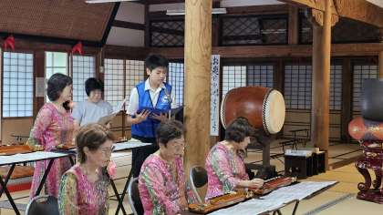 7月25日(木)平和の鐘を鳴らそうin上行寺その2 公開日 2024/07/25 更新日 2024/07/25 日々の活動から イベントが始まり、まずはオープニングの飛越サウンドによる大正琴の演奏が行われ、本校生徒が司会をしました。 参加した生徒たちも大正琴の素晴らしい音色に聞き入っています。