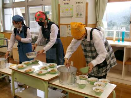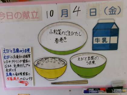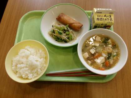 給食献立になります。今日は、エビと豆腐のうま煮と春巻きです。春巻きはパリパリでうま煮はおいしかったです。