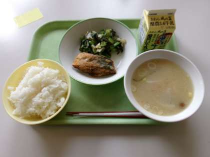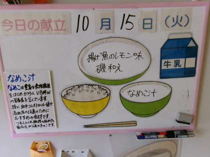 今日は揚げ魚のレモン味はさっぱり感あふれ、磯和えはのりの味が豊かで、なめこ汁はなめこや野菜の旨みがあり、ビタミンなどの栄養が豊富でした。