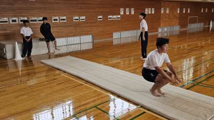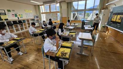 1年生は美術で風神雷神図屏風を見て感じることを探してました。2年生は保健体育で側方倒立回転の続きをしていました。3年生は数学で図形の相似でした。風神が持っている袋は筒状になっていて、風を出したりするアイテムなのですね。はじめて知りました!へぇ〜と言う生徒たちでした。