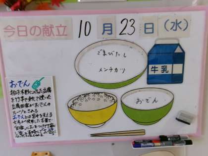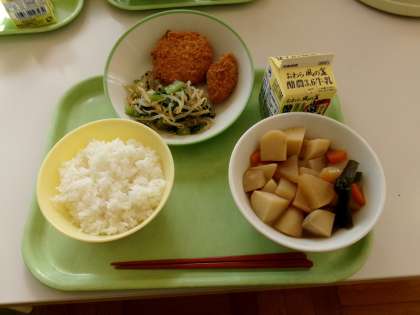 今日の献立は、メンチカツ!!サクサクで肉汁がジュワッと旨みたっぷりでした。おでんも具材がたくさんはいっていました。結び昆布がまたいい味を出しています。ごはんに合う給食でした。今日もごちそうさまでした!!