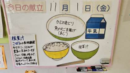 今日は魚のエゴマ揚げは外はサクサク、中は白身魚の旨味が広がりました。今週もおいしい給食をありがとうございました。