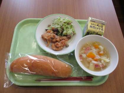 鶏の唐揚げです。しっかりと衣に味がついていてジューシーでした。野菜スープもジャガイモやにんじんなどさまざまな野菜が入っており食べ応えがありました。