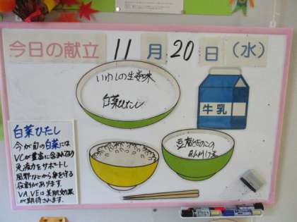 献立です。豆腐ときのこのあんかけは具材は豊富でそれぞれの素材が生かされた味でした。いわしの生姜味は、シンプルながらも身と脂のバランスがよく白菜ひたしとも合うものでした。