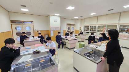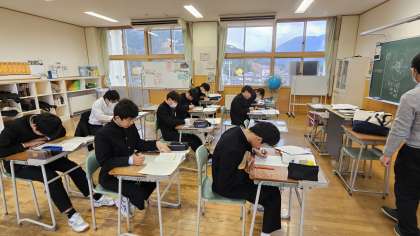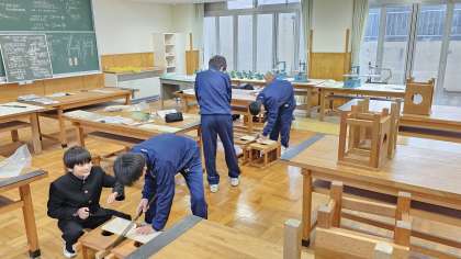 1年生は技術でシャッターボックス作りで木材を切るためにノコギリの使い方を教えてもらっています。2年生、碧空級は家庭で反物について、3年生は数学で三平方の定理の問題を解いていました。