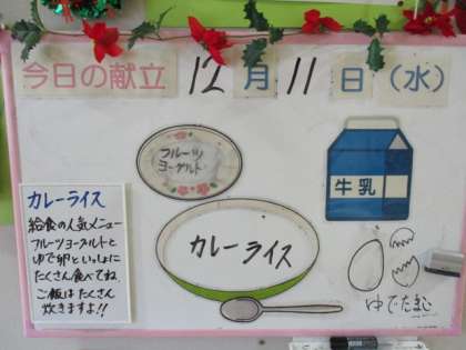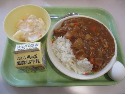 盛りつけの段階からモリモリのカレーが!ルーを余すことなくかき集め、お皿に盛りつけています。どうしてこんなにおいしいのかと言うくらい、専門店にも負けないくらい食欲をそそる香りと味わい深いカレーです。そこにゆで卵がカレーの味をまろやかにし、牛乳とフルーツヨーグルトがさらにカレーの香りと味の余韻を引き立たせてくれる大満足な献立でした。