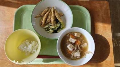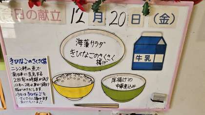 12月20日(金)給食献立 公開日 2024/12/23 更新日 2024/12/23 日々の活動から 今日はきびなごのさくさく揚げは衣がサクサク、中は旨味溢れる味で中華煮込みは挽き肉のほどよい油が食欲をそそります! 今学期もあと給食は1回です。あと1回も美味しい給食をよろしくお願いします。今週も美味しい給食をありがとうございました。 ごちそうさまでした!!
