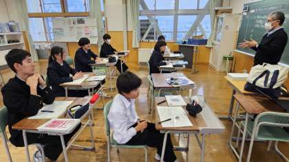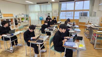 1年生は数学で多面体、3年生は英語でタブレットを使って調べています。