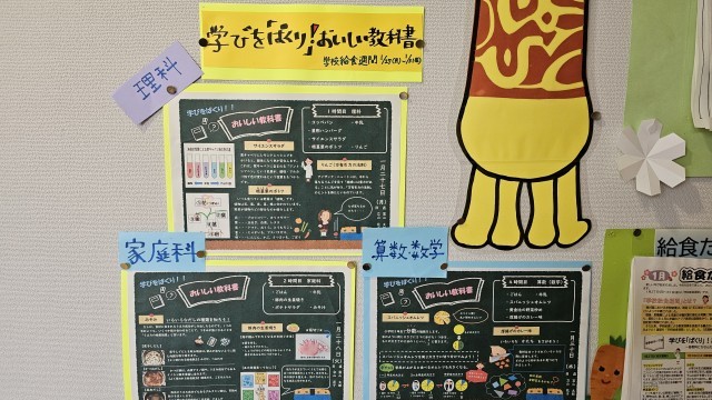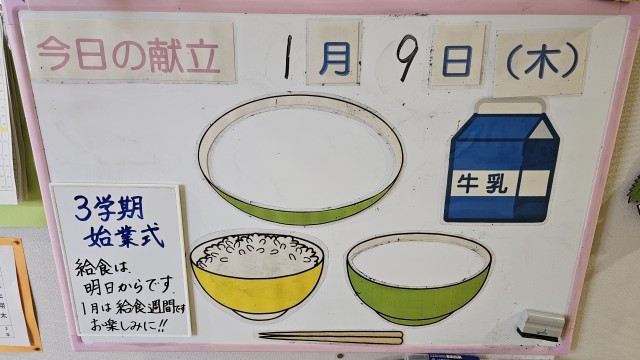 明日から給食が開始されます。当番の人はエプロン等を用意しましょう。1/25から31までは学校給食週間で、「学びをぱくりおいしい教科書」という、各教科にまつわる給食がでる企画もあるのでお楽しみに!