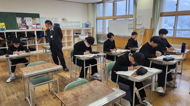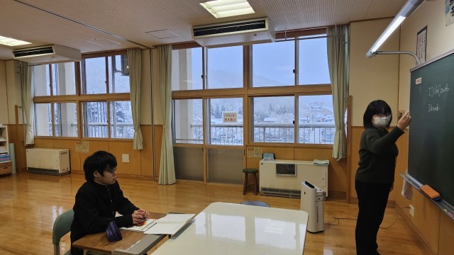 2年生は数学でどんな条件が揃うと平行四辺形になるのかについて、図形を見ながら条件を確認し、証明をしていました。複雑な条件で難しいながらも図形から見てわかりやすく学んで、理解した姿も見られました。碧空級は英語の絵本を使って、ノートに文を書きながら単語の区切りを見極め、文の作りについて学んでます。