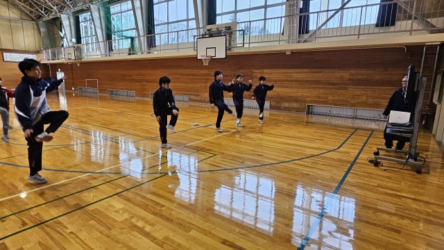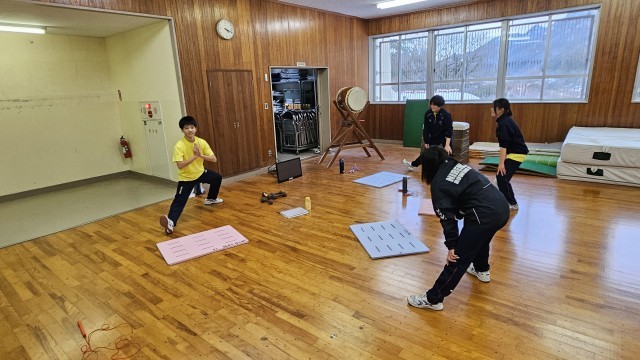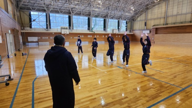 ボート部は筋力トレーニングやストレッチをしていました。陸上競技部はラントレーニングのあと、ダンスで全身を使うトレーニングをしていました。楽しそうにしていました。