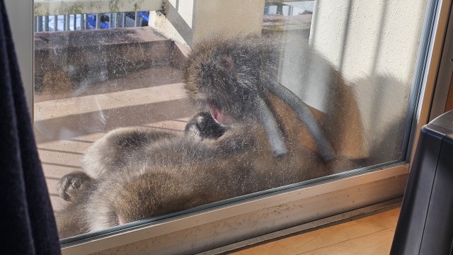 土曜日、合同練習にむけて準備をしていると、学校の外には猿の親子がのんびりとした時間を楽しんでいました。職員室のベランダでは仲間同士、毛づくろいをしている様子や1匹でぼんやりしている様子も見られました。猿の仲間同士で毛づくろいをすることは集団内で友好を深め、不安を解消しているそうです。平日はここまで間近で見ることは少なく、休日の学校は猿にとって、楽園のように過ごせる場所のようです。
