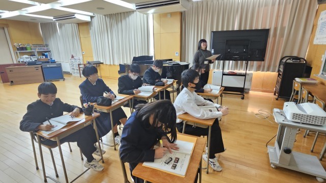 1年生は音楽で雅楽について知ろうでした。様々な楽器を見て聞いてました。「フライパンを叩いたような音がする」など様々な感想を言ってました。