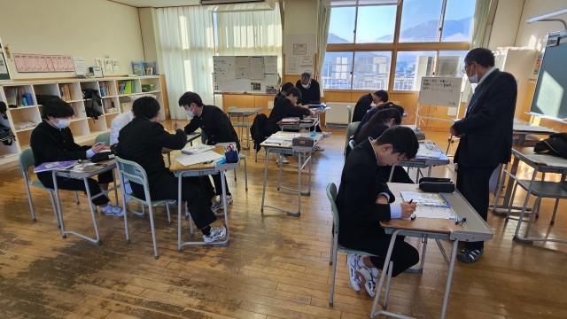 3年生は数学で平面図形、空間図形の問題にチャレンジしていました。まわりと確認しながら問題をしていました。