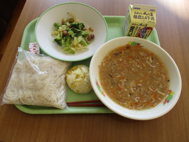 今日はソフトメンの日です!今日は肉味噌とともに食べます。ネギ、生姜、にんじん、玉ねぎ、干ししいたけ、タケノコ、豚ひき肉を醤油、味噌、砂糖、油で炒め、でんぷんを入れとろみをつけ、最後に香りづけにごま油を入れています。炒めることで素材の甘みが出て、調味料の1つ1つが肉味噌の風味、旨みを引き立ててくれています!そこにチーズとビーンズサラダの酸味がさらに肉味噌を引き立ててくれます。最後にさつまいもの入った蒸しパンと牛乳の甘さが肉味噌のコクに余韻を与えているおいしい給食でした。
