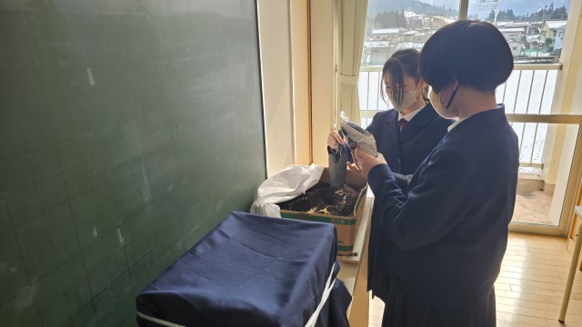 1年生の生徒が総合の時間の地域のごみ拾いからさらに発展させ、循環する資源を考えるということで手作りコンポストを製作しました。生ゴミを持ってきて、土に混ぜています。今日はぼかしとして、米ぬかを昼休みに混ぜています。栄養豊富な土を作って、春に作物を育てるそうです。ユネスコスクールらしい素晴らしい取り組みですね。
