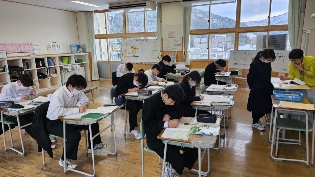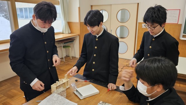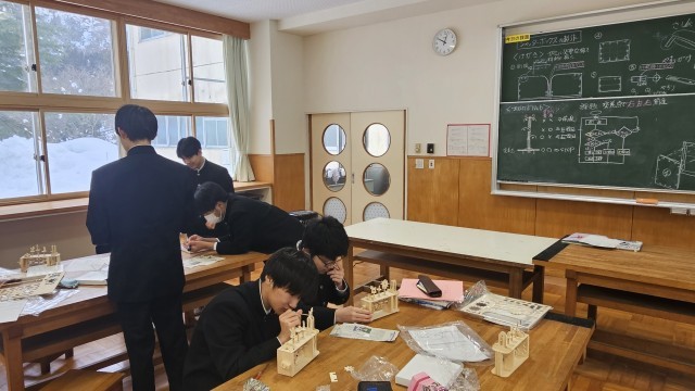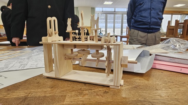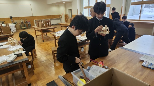 2年生は技術でカラクリメカの完成です。お互いの作品を見合ったり、修正点を調整したりしていました。すごくよい作品ができましたね。社会ではこれまでの振り返りをしていました。1年生のシャッターボックスも完成していました。