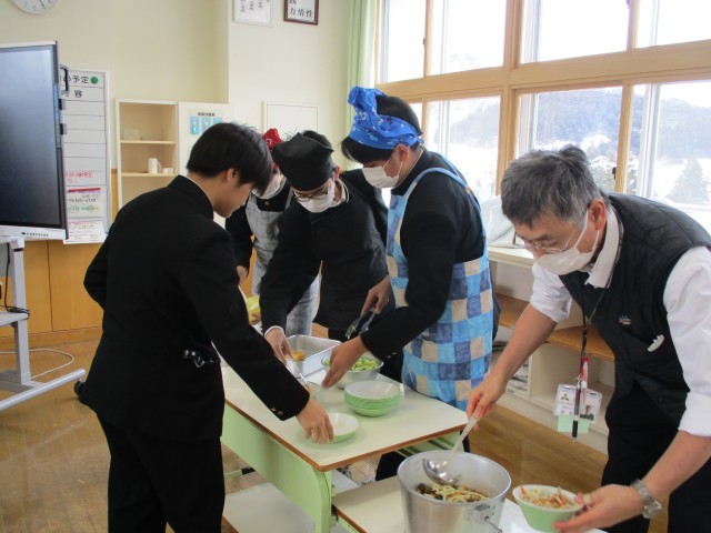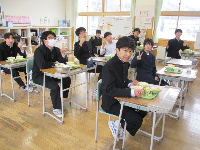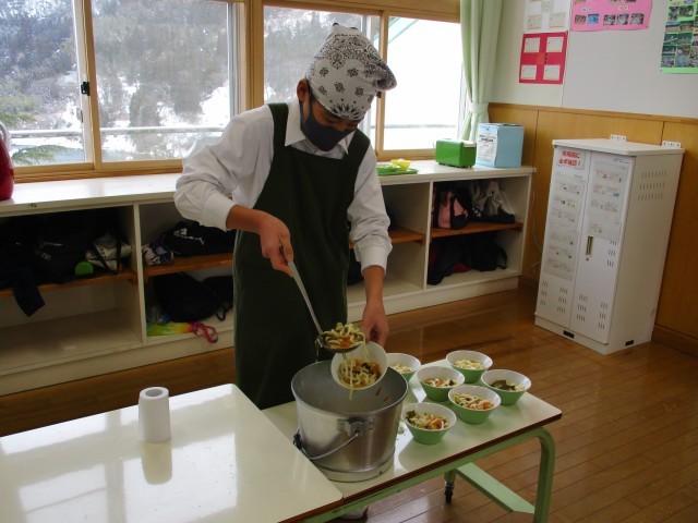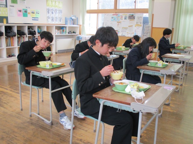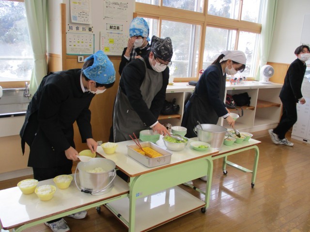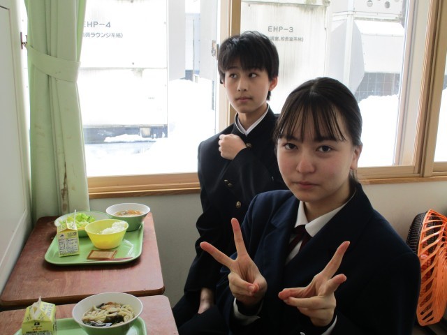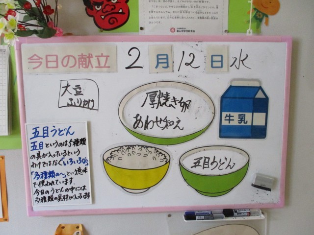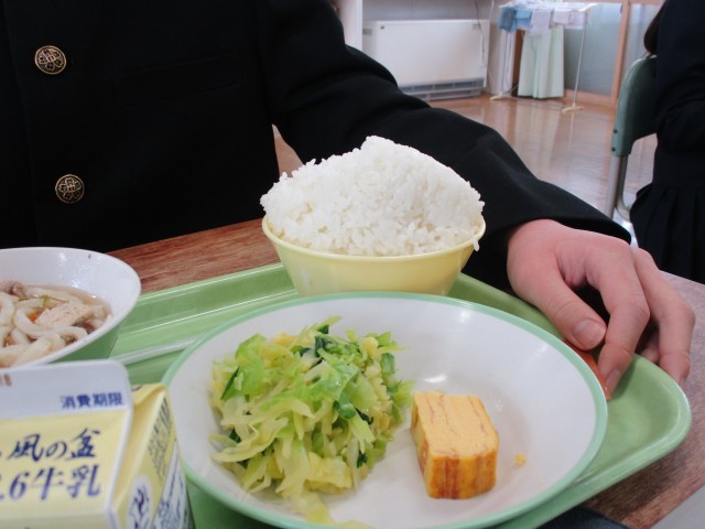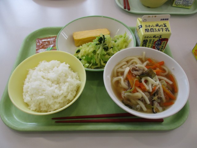 今日はごはんと五目うどんの炭水化物コンビです。ごはんもうどんも両方モリモリにしている生徒もいました。うどんはこぼさないように今日もたくさん食べて午後からも元気に活動してください。厚焼きたまごは甘く出汁が効き、合わせ和えはキャベツとたくあんの塩加減が絶妙にマッチしていてお米がとても進むメニューでした。