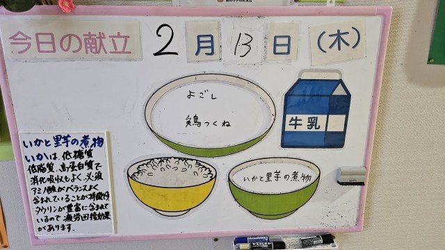献立になります。今日はいかと里芋の煮物は出汁が効いていてイカの旨味がつまっていました。