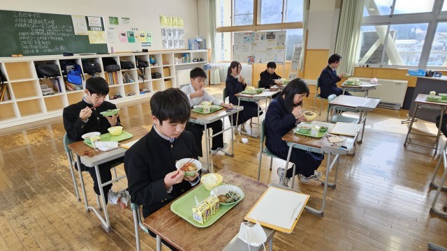 1年生は富山ESD-SDGsシンポジウムに行くので早めの給食です。発表をがんばりましょう!