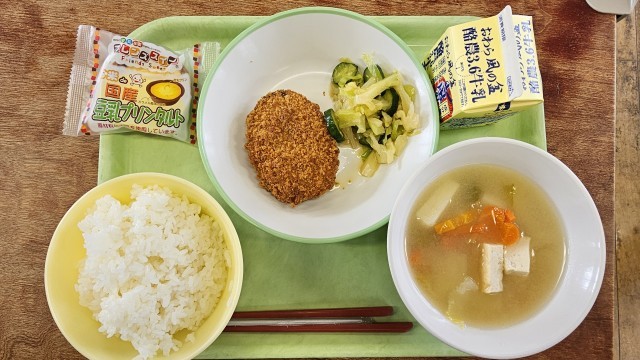 今日は選択献立で肉じゃがコロッケかマスの竜田揚げ、プリンタルトかリンゴゼリーのどちらかを選択します。