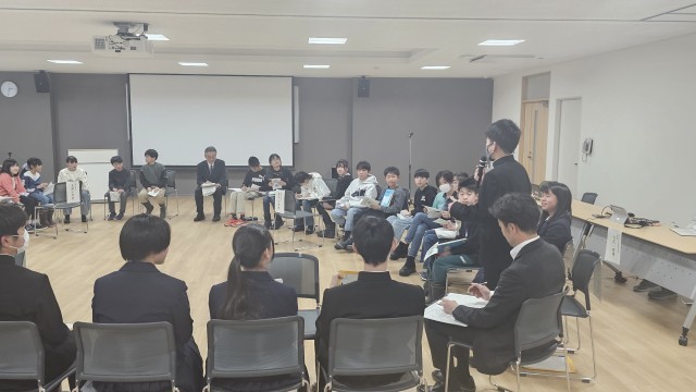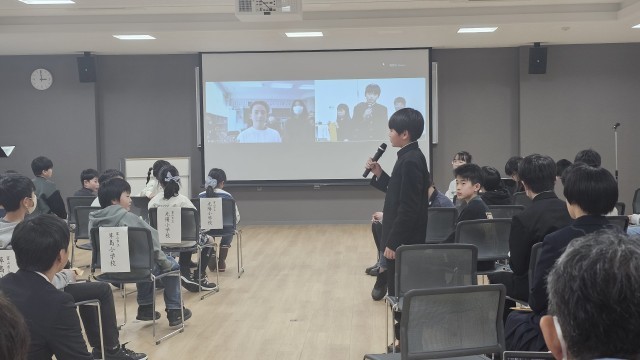 数少ない中学校の参加でしたが、堂々と発表していました。コンポスト、消臭袋を見せたり、SDGsパスポートを配り実際見てもらったりなど表現豊かに発表をしていました。発表後、会場校4校で討論会があり、小学生から積極的な質問に答えていました。最後に取材を受けている生徒もいました。