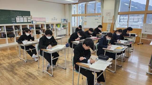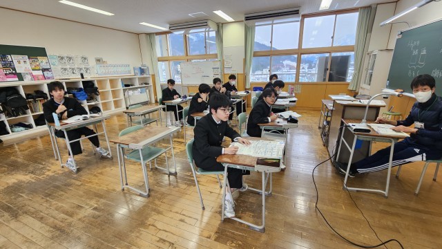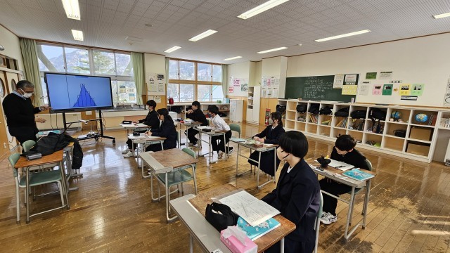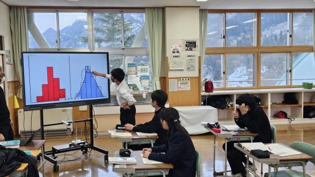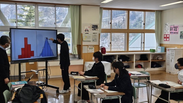 1年生は数学で度数折れ線と相対度数で、お互いに度数折れ線や相対度数について、電子黒板で図形や棒グラフを見ながらどのようになるか自分なりの言葉で説明していました。