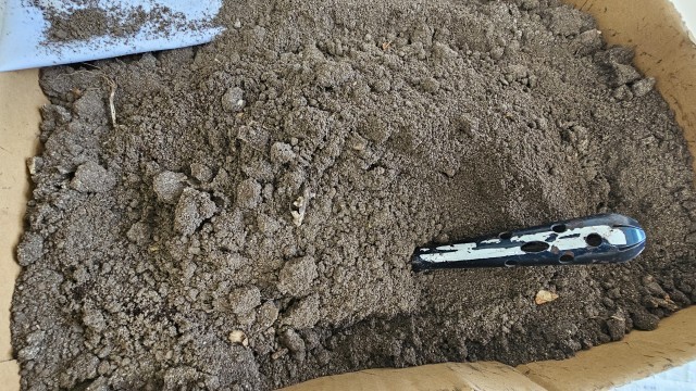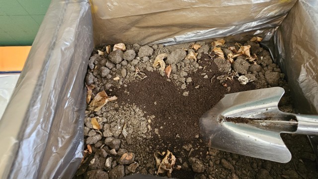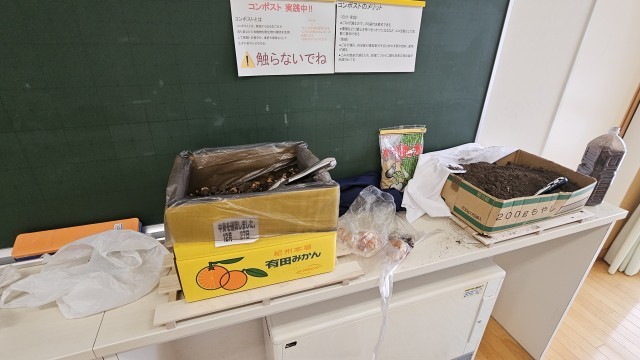 1年生の総合的な学習の時間で行っている。コンポストです。分解が進んでいます。ちょっと森のような香りが部屋を漂っていますが、コーヒーがらを入れることでにおいが低減し、分解も進みます。コンポストをやるとさまざまな変化も楽しみの1つですね。