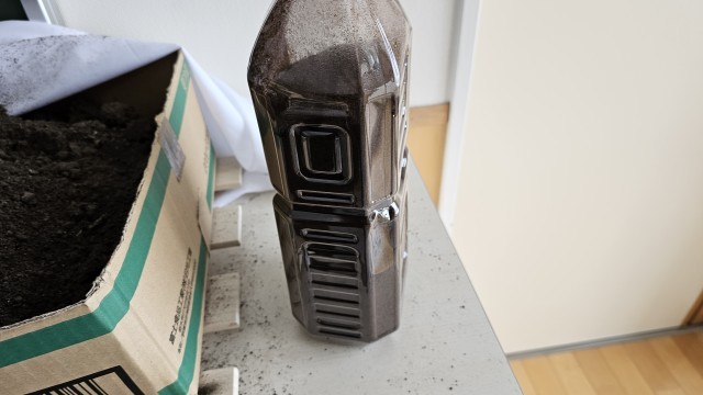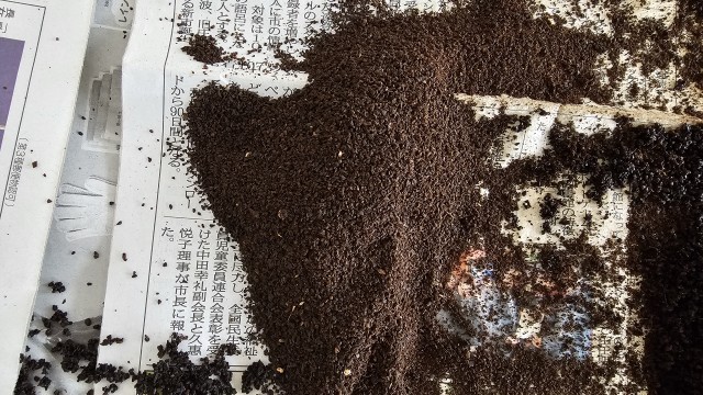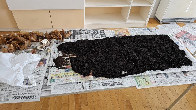 1年生のコーヒーがらを利用した肥料や消臭剤作りをしています。コーヒーがらやフィルターを乾燥させています(1枚目)。乾燥させると黒から茶に色が変化します(2枚目)。乾燥させたコーヒーがらは、ペットボトルで保管、肥料やコンポストの消臭剤にしたり、乾燥したフィルターにつめて封をすると消臭袋に、消臭効果がなくなったらさらに乾燥か定期的に撒くことで雑草の発育が抑制されるそうです。さらに撒いたところは時間がたつとコーヒーが分解され、土壌が作られるそうです。抑制したり、分解したり、消臭袋になったりとさまざまなことに活用できるとのことです。