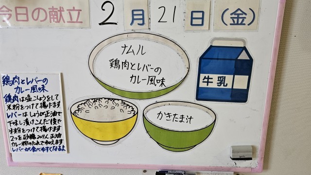 今日はレバーととりのカレー風味、レバーはあげたおかげで臭さはなく、鶏肉のさっぱりさと合わさってご飯がすすみます!そこにかきたま汁のだしの味とたまごの豊かな風味がカレー風味をリセットしてくれます。
