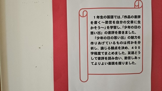 玄関前廊下では、1年生の国語の少年の日の思い出の魅力を作り上げているものはなにかを分析して、論じる観点を決めまとめたものが掲示されています。ご来校の際にはご覧ください!