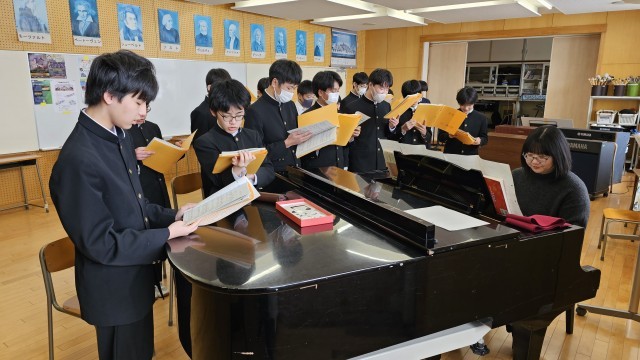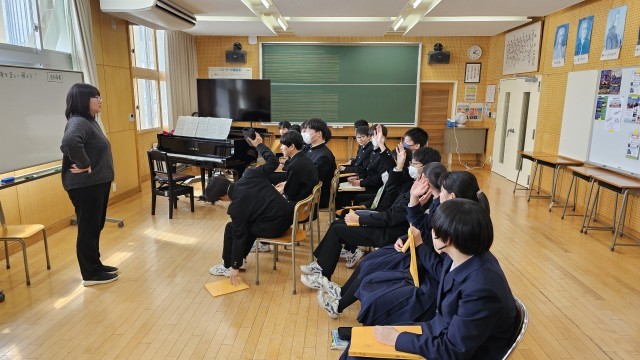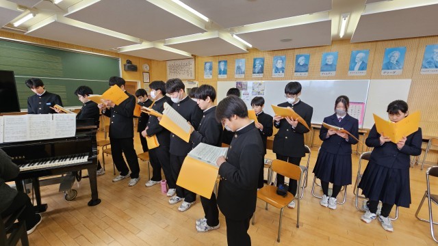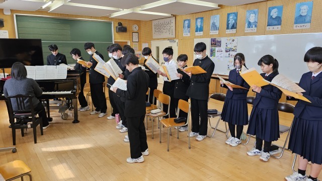 1、2年生で合同音楽を行いました。卒業式にむけての歌練習で各パートの音を正しく歌おうという課題で練習をしました。楽譜のわからない記号を聞いたり、強弱が必要なところなどうまく歌う工夫を考えていました。今日は部分部分をよくしていきました。