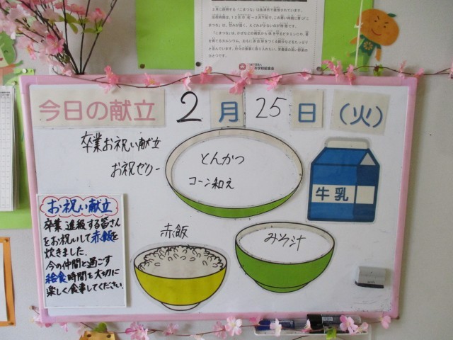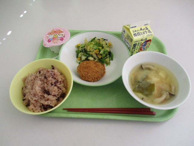 今日は卒業・進級お祝い献立ということで、赤飯、とんかつ、みそしる、野菜、ゼリーでした。