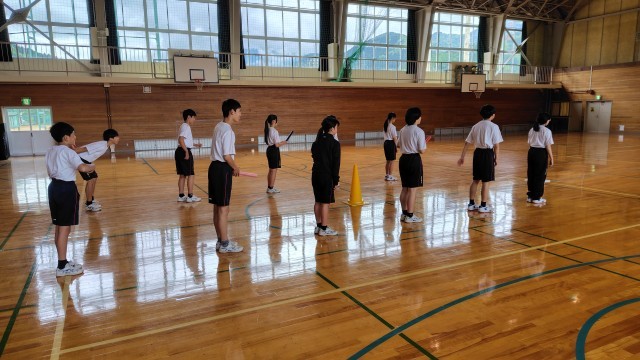 1、2年生は 合同体育でバトンの受け渡しの練習をしていました。